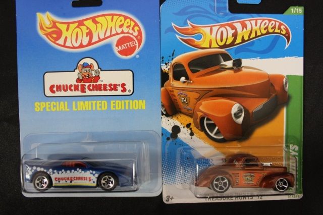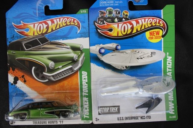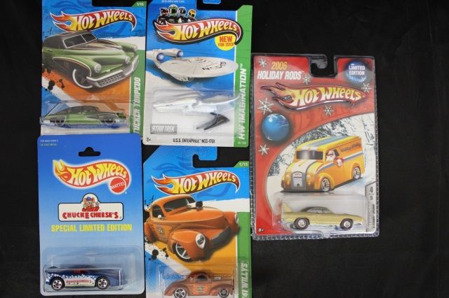 lot of five Hot Wheels that include Chuck E Cheese's, Holiday Rods 70's Plymouth Super Bid, 47 Willy's Treasure Hunt, Tucker Turpedo and Star Trek U.S.S. Enterprise
