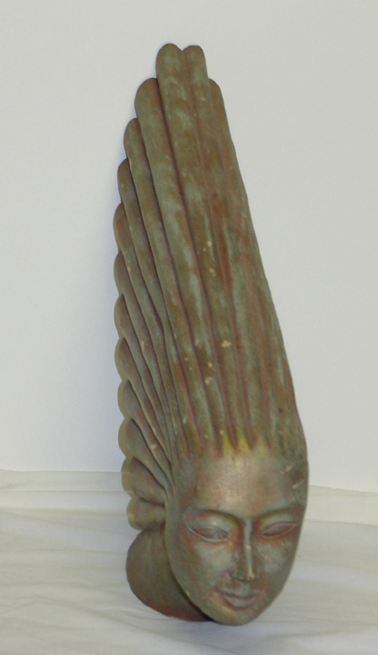 Bust in the form of the iconic Pontiac hood ornament. Made from some type of cast plaster. Approx. 25" at longest point. Sits on approx. 6.5" x 4.5" base. Was once a bronze color with a gold wash, but most of the gold is gone. A few flecks of paint are missing. No breaks or chips.
