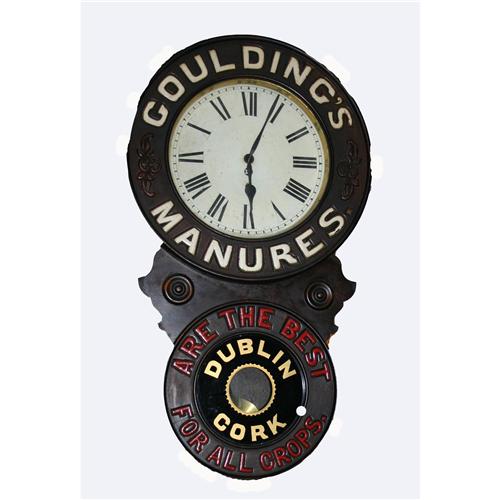 Adv. Clock - Goulding's Manures Are the Best for All Crops - Baird style. Top portion approximately 18" D with bottom being 12 ½" D, and 32" T.