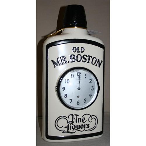Advertising Clock promoting Old Mr. Boston Fine Liquors.  Cream colored metal clock case is in shape of liquor bottle.  Embossed with black lettering.  Clock works by Gilbert.  Clock face approximately 6 ½" D.  Overall height 22".  No scratches.  Overall nice appearance.