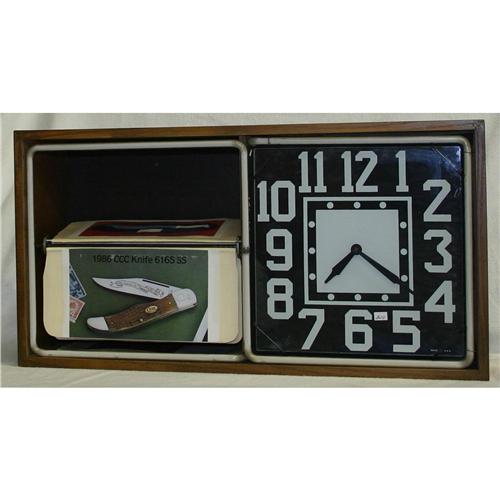 Neon Clock with Revolving Advertising Display - Rectangular clock measures approximately 23 ½" x 12 ½" H. Neon lights, clock works, and pages turn.