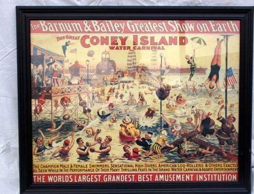 Nicely framed poster advertising Barnum & Bailey Greatest Show on Earth, The Great Coney Island Water Carnival. Performers appear to be having a wonderful time in the water. Copyrighted 1898 by the Strobridge Lithograph Co. Cincinnati & New York. Measures approximately 35" x 25" framed.