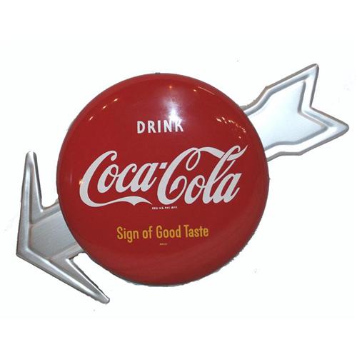 Coca-Cola Adv. Sign - Red Coca Cola Button with Silver Arrow. Drink Coca-Cola Sign of Good Taste. Measures approx.. 16" x 22." Circa 1950-60's. Great Condition.