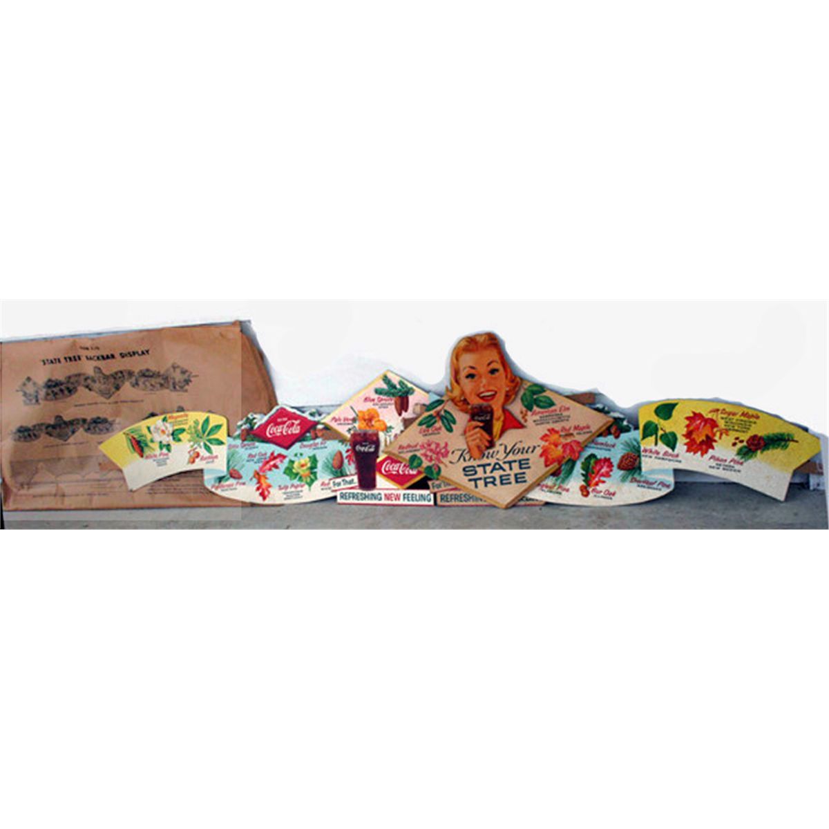 Advertising Festoon for Coca Cola featuring the state trees of all 50 states - Overall length approx. 120" when fully extended. Constructed in five sections to allow display in an arc or straight line. Also, allows for some 3 D effect. Some minor discoloration commensurate with the age of the item. Some softening of corners, but no breaks or missing pieces. Original package envelope included. A fabulous find for the consummate collector of everyting Coke.