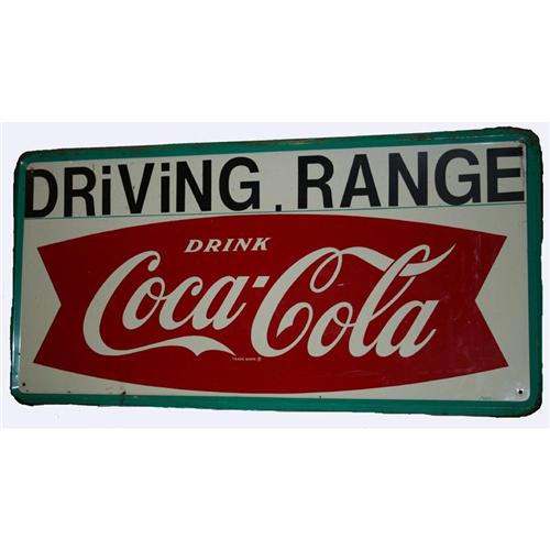 Large metal sign with large Coca Cola fishtail topped by the words Driving Range spelled out with black plastic tape.  Sign measures approx. 38" x 72".  Made is U.S.A., Otis - Robertson - 1-54.  Damage and rusting along edges, especially at corners.