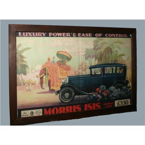 Morris Isis Advertising Sign - Framed size 24" x 26" W.  Note damage to upper left portion.  Printed in Great Britain.