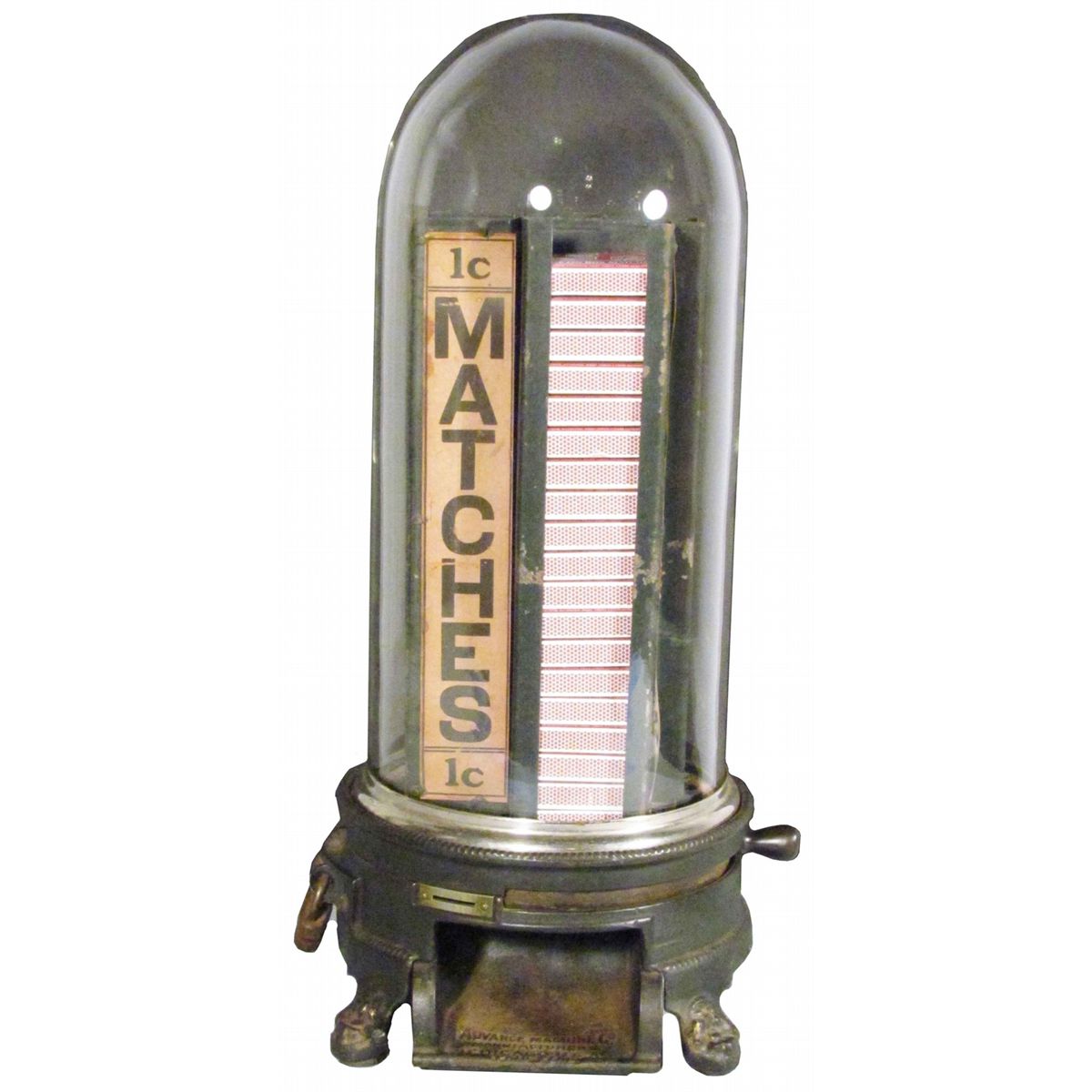 Advance Coin Operated Match Vendor. One cent. Cast iron with Glass Dome. Excellent working condition. 9 1/2 inch diameter X 17 1/2 inches tall.