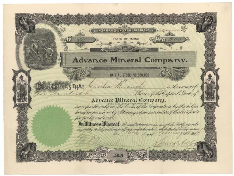 1904, Maine. Stock certificate for 500 shares. Black with green background. Six small vignettes of miners pictured within the border design. A larger vignette at top left of miners at work. Uncancelled and very fine.