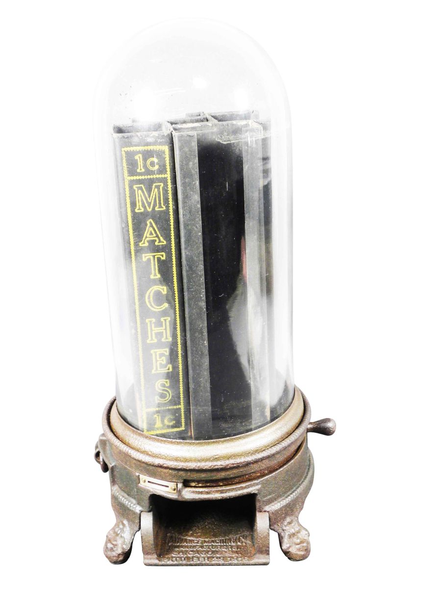 Advanced Match Dispenser w/glass dome. Advanced Machine Co., Chicago, patented 1916. Cast iron. All original condition, comes with lock and key. 8 1/2 X 17 X 8 inches.