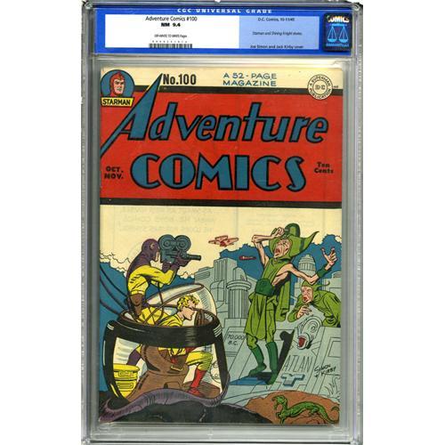 <B>Adventure Comics #100 (DC, 1945) CGC NM 9.4 Off-white to white pages.</B></I> This copy's tied for the highest grade that CGC has awarded for this issue to date. The signature of Simon and Kirby graces the cover; inside you'll find adventures of the Sandman, Starman, and the Shining Knight. Overstreet 2006 NM- 9.2 value = $1,750. CGC census 3/06: 2 in 9.4, none higher.
