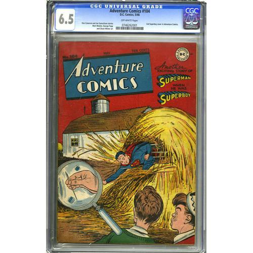 <B>Adventure Comics #104 (DC, 1946) CGC FN+ 6.5 Off-white pages.</B></I> This was just the second issue of this title's "new look," i.e. the second to star Superboy, Aquaman, Green Arrow, and Johnny Quick. The Shining Knight is the one <B>Adventure</B></I> veteran in these pages. The cover, featuring the Boy of Steel, has been credited to Stan Kaye. Overstreet 2006 FN 6.0 value = $339; VF 8.0 value = $706. CGC census 3/06: 2 in 6.5, 7 higher.
