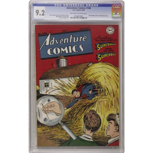 <B>Adventure Comics #104 (DC, 1946) CGC NM- 9.2 Off-white to white pages.</B></I> This was just the second issue of this title's "new look," i.e. the second to star Superboy, Aquaman, Green Arrow, and Johnny Quick. The Shining Knight is the one <B>Adventure</B></I> veteran in these pages. The cover, featuring the Boy of Steel, is just the second Superboy cover in this title. The cover art has been credited to Stan Kaye. Overstreet 2006 NM- 9.2 value = $1,525. CGC census 10/06: 2 in 9.2, 1 higher.<BR><BR><b>Shipping:</b> Slabbed Comic (<a target="_blank" href="http://www.heritageauctions.com/common/shipping.php">view shipping information</a>)