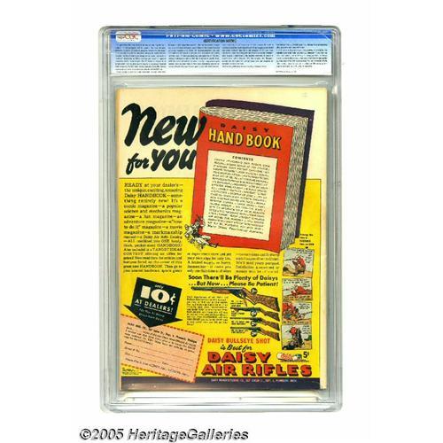 <B>Adventure Comics #106 (DC, 1946) CGC VF/NM 9.0 Off-white pages.</B></I> Superboy mops the floor with some big tough guys on this Stan Kaye cover. Speaking of clean, this copy's fresh and bright; a very minor dust shadow in the upper left corner hardly detracts from the overall eye-appeal. Joe Shuster, George Papp, Mort Meskin, Chuck Winter, and Louis Cazeneuve all contribute interior art. Overstreet 2005 VF/NM 9.0 value = $778; NM- 9.2 value = $1050. CGC census 8/05: 1 in 9.0, none higher. <BR><BR><B>Important notice:</B> Heritage usually auctions material at the rate of 200-250 lots per hour. On some occasions eBay Live bid software or the Internet may not be able to keep up with the pace of the auction. We recommend placing a realistic absentee bid now as insurance to avoid disappointment. Occasionally the auctioneer may eliminate or reject an eBay Live bid, and the auctioneer may also reopen a lot after the close of the eBay live bidding (usually because we missed an audience bid), and may reject your bid even if it shows you as the winning bidder. By bidding via eBay Live, you agree that Heritage may award the lot to another bidder at its sole discretion under the circumstances described above or any other reasonable circumstances. Since eBay bids are not shown to us until we open the lot on the floor, we treat those bids just like floor bids. In most cases the floor responds before the eBay bid is presented to us, due to Internet lag time, so for consistency we have made it a policy that floor bids are always considered first over tie eBay live bids. Also please note that all Heritage lots purchased through eBay Live carry a 20% Buyer's Premium. Please make sure you read the Terms and Conditions before you bid. This lot is being auctioned in conjunction with a live floor auction by Heritage Galleries & Auctioneers. All final auction and invoice information will be supplied by Heritage Galleries & Auctioneers, and all other information should be considered pr