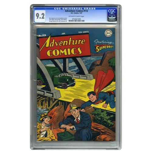 <B>Adventure Comics #112 (DC, 1947) CGC NM- 9.2 Off-white to white pages.</B></I> Just one copy of this book has been graded higher to date! Cover star Superboy is joined by Green Arrow, Aquaman, the Shining Knight, and Johnny Quick in this hero-packed issue. Overstreet 2006 NM- 9.2 value = $940. CGC census 3/06: 1 in 9.2, 1 higher.