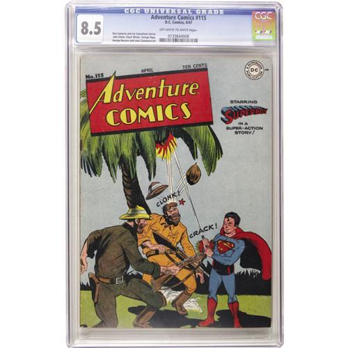 <B>Adventure Comics #115 (DC, 1947) CGC VF+ 8.5 Off-white to white pages.</B></I> This high-grade beauty is the finest specimen known... well <I>almost</B></I>! Only the "D" copy's 9.4 representative beats it. These late '40s DCs are tough to find in high grade -- but you just have! Overstreet 2006 VF 8.0 value = $438; VF/NM 9.0 value = $689. CGC census 10/06: 1 in 8.5, 1 higher.<BR><BR><b>Shipping:</b> Slabbed Comic (<a target="_blank" href="http://www.heritageauctions.com/common/shipping.php">view shipping information</a>)