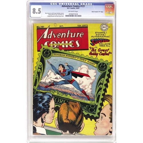 <B>Adventure Comics #121 Davis Crippen ("D" Copy) pedigree (DC, 1947) CGC VF+ 8.5 Off-white pages.</B></I> Featuring Superboy, Aquaman, Green Arrow, and Johnny Quick. Cover and art by George Roussos. This is the highest-graded copy certified by CGC to date. Overstreet 2006 VF 8.0 value = $381; VF/NM 9.0 value = $603. CGC census 7/06: 1 in 8.5, none higher. <I>From the Crippen Collection.</B></I> <BR><BR><B>Important notice:</B> Heritage usually auctions material at the rate of 200-250 lots per hour. On some occasions eBay Live bid software or the Internet may not be able to keep up with the pace of the auction. We recommend placing a realistic absentee bid now as insurance to avoid disappointment. Occasionally the auctioneer may eliminate or reject an eBay Live bid, and the auctioneer may also reopen a lot after the close of the eBay live bidding (usually because we missed an audience bid), and may reject your bid even if it shows you as the winning bidder. By bidding via eBay Live, you agree that Heritage may award the lot to another bidder at its sole discretion under the circumstances described above or any other reasonable circumstances. Since eBay bids are not shown to us until we open the lot on the floor, we treat those bids just like floor bids. In most cases the floor responds before the eBay bid is presented to us, due to Internet lag time, so for consistency we have made it a policy that floor bids are always considered first over tie eBay live bids. Also please note that all Heritage lots purchased through eBay Live carry a 22.5% Buyer's Premium. Please make sure you read the Terms and Conditions before you bid. This lot is being auctioned in conjunction with a live floor auction by Heritage Auction Galleries. All final auction and invoice information will be supplied by Heritage Auction Galleries, and all other information should be considered preliminary. Lot:41001 <BR><BR><B>Winning Notification and Billing:</B> After the FINAL session in this auction is complete, Heritage will send e-mail and snail mail invoices. This process normally takes several days. All final auction and invoice information will be supplied by Heritage Auction Galleries, and all other information should be considered preliminary. <BR><BR>This auction will be conducted on a live auction floor and over the Internet through eBay Live. If you choose to place an absentee bid, please take a moment to <font color='#0000ff'><u><a href='http://pages.ebay.com/liveauctions/help/before/laabsentee.html'>learn how eBay Live absentee bidding works</a></u></font><font color='#000000'>