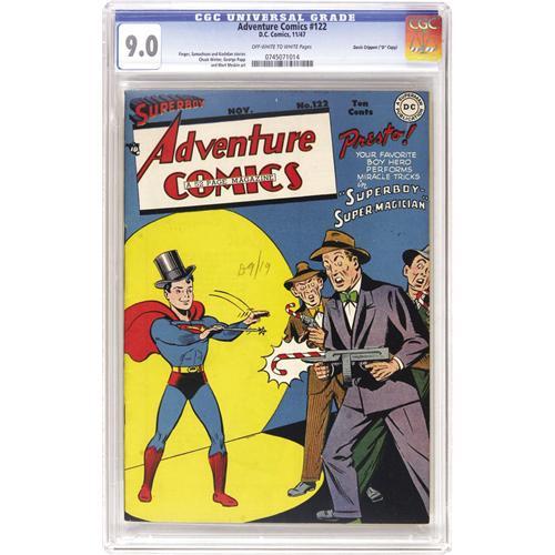 <B>Adventure Comics #122 Davis Crippen ("D" Copy) pedigree (DC, 1947) CGC VF/NM 9.0 Off-white to white pages.</B></I> In addition to the Superboy feature, there's a Johnny Quick story with Mort Meskin art, as well as adventures of Green Arrow, Aquaman, and the Shining Knight. Overstreet 2006 VF/NM 9.0 value = $603; NM- 9.2 value = $825. CGC census 7/06: 1 in 9.0, 1 higher. <I>From the Crippen Collection.</B></I> <BR><BR><B>Important notice:</B> Heritage usually auctions material at the rate of 200-250 lots per hour. On some occasions eBay Live bid software or the Internet may not be able to keep up with the pace of the auction. We recommend placing a realistic absentee bid now as insurance to avoid disappointment. Occasionally the auctioneer may eliminate or reject an eBay Live bid, and the auctioneer may also reopen a lot after the close of the eBay live bidding (usually because we missed an audience bid), and may reject your bid even if it shows you as the winning bidder. By bidding via eBay Live, you agree that Heritage may award the lot to another bidder at its sole discretion under the circumstances described above or any other reasonable circumstances. Since eBay bids are not shown to us until we open the lot on the floor, we treat those bids just like floor bids. In most cases the floor responds before the eBay bid is presented to us, due to Internet lag time, so for consistency we have made it a policy that floor bids are always considered first over tie eBay live bids. Also please note that all Heritage lots purchased through eBay Live carry a 22.5% Buyer's Premium. Please make sure you read the Terms and Conditions before you bid. This lot is being auctioned in conjunction with a live floor auction by Heritage Auction Galleries. All final auction and invoice information will be supplied by Heritage Auction Galleries, and all other information should be considered preliminary. Lot:41001 <BR><BR><B>Winning Notification and Billing:</B> After the FINAL session in this auction is complete, Heritage will send e-mail and snail mail invoices. This process normally takes several days. All final auction and invoice information will be supplied by Heritage Auction Galleries, and all other information should be considered preliminary. <BR><BR>This auction will be conducted on a live auction floor and over the Internet through eBay Live. If you choose to place an absentee bid, please take a moment to <font color='#0000ff'><u><a href='http://pages.ebay.com/liveauctions/help/before/laabsentee.html'>learn how eBay Live absentee bidding works</a></u></font><font color='#000000'>