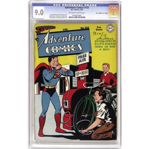 <B>Adventure Comics #125 Davis Crippen ("D" Copy) pedigree (DC, 1948) CGC VF/NM 9.0 Off-white to white pages.</B></I> Superboy's super lungs come in handy on the cover of this book, by Stan Kaye. In addition to the Boy of Steel, there are features starring Green Arrow, Aquaman, Johnny Quick, and the Shining Knight, and Mort Meskin and George Papp are among the issue's artists. Overstreet 2006 VF/NM 9.0 value = $603; NM- 9.2 value = $805. CGC census 7/06: 2 in 9.0, 1 higher. <I>From the Crippen Collection.</B></I> <BR><BR><B>Important notice:</B> Heritage usually auctions material at the rate of 200-250 lots per hour. On some occasions eBay Live bid software or the Internet may not be able to keep up with the pace of the auction. We recommend placing a realistic absentee bid now as insurance to avoid disappointment. Occasionally the auctioneer may eliminate or reject an eBay Live bid, and the auctioneer may also reopen a lot after the close of the eBay live bidding (usually because we missed an audience bid), and may reject your bid even if it shows you as the winning bidder. By bidding via eBay Live, you agree that Heritage may award the lot to another bidder at its sole discretion under the circumstances described above or any other reasonable circumstances. Since eBay bids are not shown to us until we open the lot on the floor, we treat those bids just like floor bids. In most cases the floor responds before the eBay bid is presented to us, due to Internet lag time, so for consistency we have made it a policy that floor bids are always considered first over tie eBay live bids. Also please note that all Heritage lots purchased through eBay Live carry a 22.5% Buyer's Premium. Please make sure you read the Terms and Conditions before you bid. This lot is being auctioned in conjunction with a live floor auction by Heritage Auction Galleries. All final auction and invoice information will be supplied by Heritage Auction Galleries, and all other information should be considered preliminary. Lot:41001 <BR><BR><B>Winning Notification and Billing:</B> After the FINAL session in this auction is complete, Heritage will send e-mail and snail mail invoices. This process normally takes several days. All final auction and invoice information will be supplied by Heritage Auction Galleries, and all other information should be considered preliminary. <BR><BR>This auction will be conducted on a live auction floor and over the Internet through eBay Live. If you choose to place an absentee bid, please take a moment to <font color='#0000ff'><u><a href='http://pages.ebay.com/liveauctions/help/before/laabsentee.html'>learn how eBay Live absentee bidding works</a></u></font><font color='#000000'>