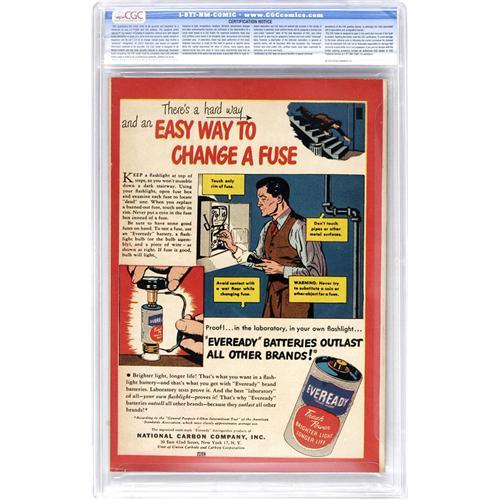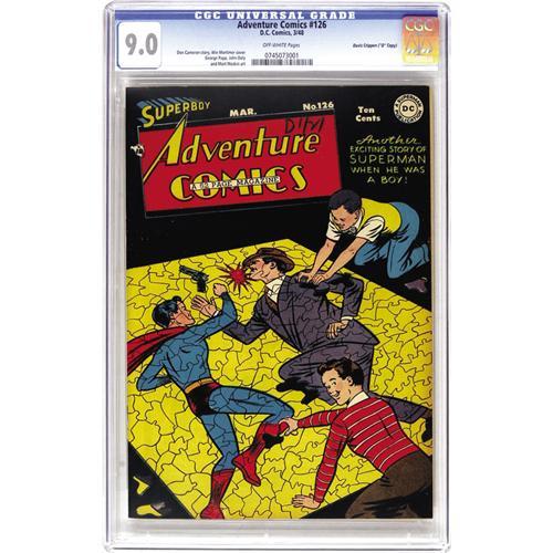 <B>Adventure Comics #126 Davis Crippen ("D" Copy) pedigree (DC, 1948) CGC VF/NM 9.0 Off-white pages.</B></I> Superboy plays a criminal a little chin music on this clever cover by Win Mortimer. The issue has interior art by George Papp and Mort Meskin. The adventures of Green Arrow, Aquaman, and Johnny Quick are all featured inside as well. This is the highest graded copy in the CGC census, with the next highest grading at 6.0. Gerber rates it a "5", or "less than average," but this is the first time we've offered one, suggesting it may be less common than previously believed. Overstreet 2006 VF/NM 9.0 value = $603; NM- 9.2 value = $825. CGC census 7/06: 1 in 9.0, none higher. <I>From the Crippen Collection.</B></I> <BR><BR><B>Important notice:</B> Heritage usually auctions material at the rate of 200-250 lots per hour. On some occasions eBay Live bid software or the Internet may not be able to keep up with the pace of the auction. We recommend placing a realistic absentee bid now as insurance to avoid disappointment. Occasionally the auctioneer may eliminate or reject an eBay Live bid, and the auctioneer may also reopen a lot after the close of the eBay live bidding (usually because we missed an audience bid), and may reject your bid even if it shows you as the winning bidder. By bidding via eBay Live, you agree that Heritage may award the lot to another bidder at its sole discretion under the circumstances described above or any other reasonable circumstances. Since eBay bids are not shown to us until we open the lot on the floor, we treat those bids just like floor bids. In most cases the floor responds before the eBay bid is presented to us, due to Internet lag time, so for consistency we have made it a policy that floor bids are always considered first over tie eBay live bids. Also please note that all Heritage lots purchased through eBay Live carry a 22.5% Buyer's Premium. Please make sure you read the Terms and Conditions before you bid. This lot is being auctioned in conjunction with a live floor auction by Heritage Auction Galleries. All final auction and invoice information will be supplied by Heritage Auction Galleries, and all other information should be considered preliminary. Lot:41001 <BR><BR><B>Winning Notification and Billing:</B> After the FINAL session in this auction is complete, Heritage will send e-mail and snail mail invoices. This process normally takes several days. All final auction and invoice information will be supplied by Heritage Auction Galleries, and all other information should be considered preliminary. <BR><BR>This auction will be conducted on a live auction floor and over the Internet through eBay Live. If you choose to place an absentee bid, please take a moment to <font color='#0000ff'><u><a href='http://pages.ebay.com/liveauctions/help/before/laabsentee.html'>learn how eBay Live absentee bidding works</a></u></font><font color='#000000'>