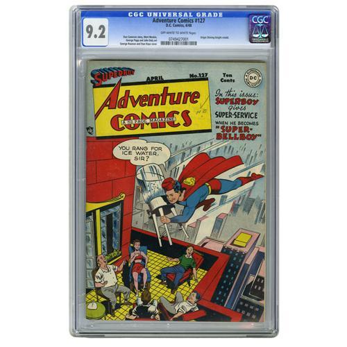 <B>Adventure Comics #127 (DC, 1948) CGC NM- 9.2 Off-white to white pages.</B></I> George Roussos and Stan Kaye are credited with this Superboy cover. Inside the comic, the Boy of Steel is joined by Aquaman, Green Arrow, Johnny Quick, and the Shining Knight. The origin of the latter is retold. Overstreet 2006 NM- 9.2 value = $825. CGC census 3/06: 1 in 9.2, 1 higher.
