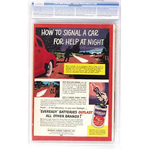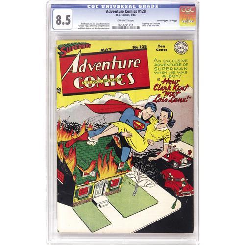 <B>Adventure Comics #128 Davis Crippen ("D" Copy) pedigree (DC, 1948) CGC VF+ 8.5 Off-white pages.</B></I> This is the only copy of this issue graded above 6.5 by CGC as of this writing, and it's a key issue indeed... what else would you call the first meeting between Superman and Lois Lane? It happened back when Superman was still Superboy, of course. The issue's cover is by Win Mortimer. Overstreet 2006 VF 8.0 value = $381; VF/NM 9.0 value = $603. CGC census 6/06: 1 in 8.5, none higher. <I>From the Crippen Collection.</B></I> <BR><BR><B>Important notice:</B> Heritage usually auctions material at the rate of 200-250 lots per hour. On some occasions eBay Live bid software or the Internet may not be able to keep up with the pace of the auction. We recommend placing a realistic absentee bid now as insurance to avoid disappointment. Occasionally the auctioneer may eliminate or reject an eBay Live bid, and the auctioneer may also reopen a lot after the close of the eBay live bidding (usually because we missed an audience bid), and may reject your bid even if it shows you as the winning bidder. By bidding via eBay Live, you agree that Heritage may award the lot to another bidder at its sole discretion under the circumstances described above or any other reasonable circumstances. Since eBay bids are not shown to us until we open the lot on the floor, we treat those bids just like floor bids. In most cases the floor responds before the eBay bid is presented to us, due to Internet lag time, so for consistency we have made it a policy that floor bids are always considered first over tie eBay live bids. Also please note that all Heritage lots purchased through eBay Live carry a 22.5% Buyer's Premium. Please make sure you read the Terms and Conditions before you bid. This lot is being auctioned in conjunction with a live floor auction by Heritage Auction Galleries. All final auction and invoice information will be supplied by Heritage Auction Galleries, and all other information should be considered preliminary. Lot:41001 <BR><BR><B>Winning Notification and Billing:</B> After the FINAL session in this auction is complete, Heritage will send e-mail and snail mail invoices. This process normally takes several days. All final auction and invoice information will be supplied by Heritage Auction Galleries, and all other information should be considered preliminary. <BR><BR>This auction will be conducted on a live auction floor and over the Internet through eBay Live. If you choose to place an absentee bid, please take a moment to <font color='#0000ff'><u><a href='http://pages.ebay.com/liveauctions/help/before/laabsentee.html'>learn how eBay Live absentee bidding works</a></u></font><font color='#000000'>