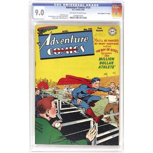 <B>Adventure Comics #131 Davis Crippen ("D" Copy) pedigree (DC, 1948) CGC VF/NM 9.0 Off-white to white pages.</B></I> Features Superboy, Shining Knight, Aquaman, Green Arrow, and Johnny Quick. Art by George Roussos, George Papp, and Mort Meskin. This is the only unrestored copy certified by CGC to date. Overstreet 2006 VF/NM 9.0 value = $504; NM- 9.2 value = $685. CGC census 7/06: 1 in 9.0, none higher. <I>From the Crippen Collection.</B></I> <BR><BR><B>Important notice:</B> Heritage usually auctions material at the rate of 200-250 lots per hour. On some occasions eBay Live bid software or the Internet may not be able to keep up with the pace of the auction. We recommend placing a realistic absentee bid now as insurance to avoid disappointment. Occasionally the auctioneer may eliminate or reject an eBay Live bid, and the auctioneer may also reopen a lot after the close of the eBay live bidding (usually because we missed an audience bid), and may reject your bid even if it shows you as the winning bidder. By bidding via eBay Live, you agree that Heritage may award the lot to another bidder at its sole discretion under the circumstances described above or any other reasonable circumstances. Since eBay bids are not shown to us until we open the lot on the floor, we treat those bids just like floor bids. In most cases the floor responds before the eBay bid is presented to us, due to Internet lag time, so for consistency we have made it a policy that floor bids are always considered first over tie eBay live bids. Also please note that all Heritage lots purchased through eBay Live carry a 22.5% Buyer's Premium. Please make sure you read the Terms and Conditions before you bid. This lot is being auctioned in conjunction with a live floor auction by Heritage Auction Galleries. All final auction and invoice information will be supplied by Heritage Auction Galleries, and all other information should be considered preliminary. Lot:41001 <BR><BR><B>Winning Notification and Billing:</B> After the FINAL session in this auction is complete, Heritage will send e-mail and snail mail invoices. This process normally takes several days. All final auction and invoice information will be supplied by Heritage Auction Galleries, and all other information should be considered preliminary. <BR><BR>This auction will be conducted on a live auction floor and over the Internet through eBay Live. If you choose to place an absentee bid, please take a moment to <font color='#0000ff'><u><a href='http://pages.ebay.com/liveauctions/help/before/laabsentee.html'>learn how eBay Live absentee bidding works</a></u></font><font color='#000000'>