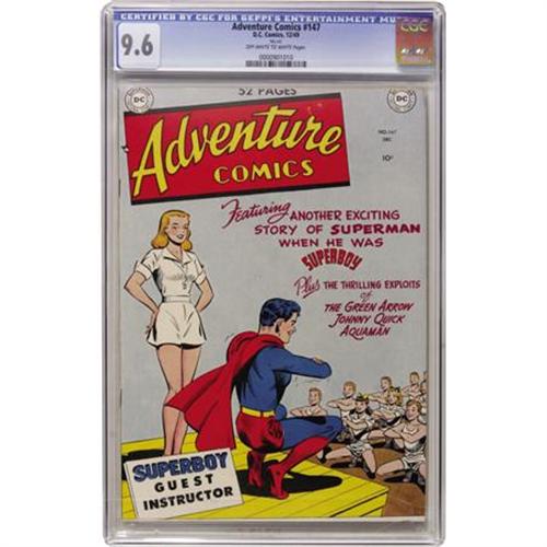 <B>Adventure Comics #147 (DC, 1949) CGC NM+ 9.6 Off-white to white pages.</B></I> Unbelievably fresh copy from 1947, and it isn't even a pedigreed copy! To illustrate its rarity, CGC has certified only one other copy of #147, and at VF 8.0, it's far inferior to this beauty. CGC notes that the cover has been "Mis-cut". Overstreet 2007 NM- 9.2 value = $710. CGC census 5/07: 1 in 9.6, none higher.<BR><BR><b>Shipping:</b> Comics - Slabbed (certified) (<a target="_blank" href="http://www.heritageauctions.com/common/shipping.php">view shipping information</a>)