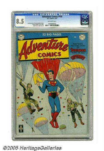 <B>Adventure Comics #150 (DC, 1950) CGC VF+ 8.5 Off-white pages.</B></I> Frank Frazetta art (on the Shining Knight feature) makes this book worth a bid all by itself, but this 52-pager also has adventures of Superboy, Aquaman, Green Arrow, and Johnny Quick. Plus, no copy has been graded higher by CGC to date. Overstreet 2005 VF 8.0 value = $413; VF/NM 9.0 value = $637. CGC census 6/05: 2 in 8.5, none higher.