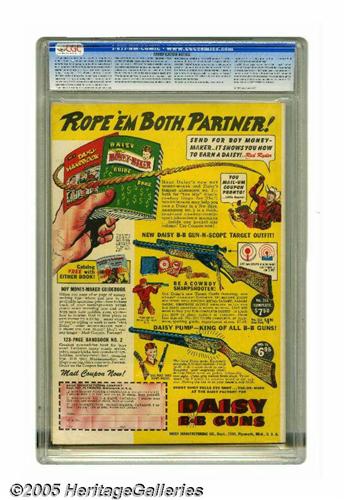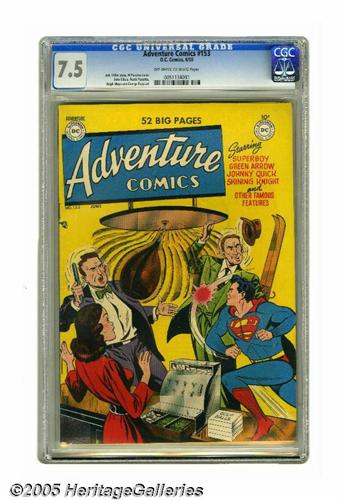 <B>Adventure Comics #153 (DC, 1950) CGC VF- 7.5 Off-white to white pages.</B></I> This is one of the 1950s adventure issues that's especially prized since it has Frank Frazetta interior art on the Shining Knight feature. But there's much more here too: the adventures of Superboy, Johnny Quick, and Green Arrow. The cover scene, with the Boy of Steel protecting the sporting-goods stores of Smallville, has been credited to Al Plastino. Overstreet 2005 VF 8.0 value = $413. CGC census 6/05: 1 in 7.5, none higher.