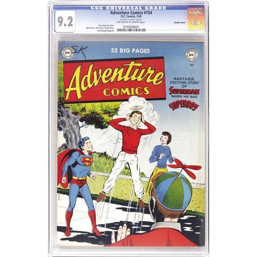 "<B>Adventure Comics #154 Double Cover (DC, 1950) CGC NM- 9.2 Off-white to white pages.</B></I> That crazy fad of 1950, the ""propeller beanie"", is spotlighted on this colorful Superboy cover. And speaking of covers, this book has that rare distinction of having an extra cover added (by error) by the printer! CGC notes, ""1st cover 7.0, interior cover 9.2"". This one currently leads the CGC pack by a country mile, with the next-highest copy clocking in at 7.5. Overstreet 2006 NM- 9.2 value = $585. CGC census 5/06: 1 in 9.2, none higher. <BR><BR><B>Important notice:</B> Heritage usually auctions material at the rate of 200-250 lots per hour. On some occasions eBay Live bid software or the Internet may not be able to keep up with the pace of the auction. We recommend placing a realistic absentee bid now as insurance to avoid disappointment. Occasionally the auctioneer may eliminate or reject an eBay Live bid, and the auctioneer may also reopen a lot after the close of the eBay live bidding (usually because we missed an audience bid), and may reject your bid even if it shows you as the winning bidder. By bidding via eBay Live, you agree that Heritage may award the lot to another bidder at its sole discretion under the circumstances described above or any other reasonable circumstances. Since eBay bids are not shown to us until we open the lot on the floor, we treat those bids just like floor bids. In most cases the floor responds before the eBay bid is presented to us, due to Internet lag time, so for consistency we have made it a policy that floor bids are always considered first over tie eBay live bids. Also please note that all Heritage lots purchased through eBay Live carry a 22.5% Buyer's Premium. Please make sure you read the Terms and Conditions before you bid. This lot is being auctioned in conjunction with a live floor auction by Heritage Auction Galleries. All final auction and invoice information will be supplied by Heritage Auction Galleries, and all other information should be considered preliminary. Lot:42024 <BR><BR><B>Winning Notification and Billing:</B> After the FINAL session in this auction is complete, Heritage will send e-mail and snail mail invoices. This process normally takes several days. All final auction and invoice information will be supplied by Heritage Auction Galleries, and all other information should be considered preliminary. <BR><BR>This auction will be conducted on a live auction floor and over the Internet through eBay Live. If you choose to place an absentee bid, please take a moment to <font color='#0000ff'><u><a href='http://pages.ebay.com/liveauctions/help/before/laabsentee.html'>learn how eBay Live absentee bidding works</a></u></font><font color='#000000'>"