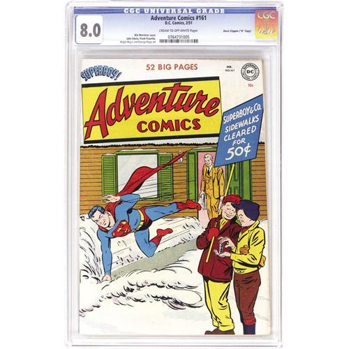<B>Adventure Comics #161 Davis Crippen ("D" Copy) pedigree (DC, 1951) CGC VF 8.0 Cream to off-white pages.</B></I> Frank Frazetta completionists are enjoying this catalog's selection of "D" copies, and here's yet another book with Frazetta art: he drew the Shining Knight feature. Other stories star Superboy, Johnny Quick, and Green Arrow. The issue has a Win Mortimer cover. Overstreet 2006 VF 8.0 value = $419. CGC census 6/06: 1 in 8.0, 2 higher. <I>From the Crippen Collection.</B></I> <BR><BR><B>Important notice:</B> Heritage usually auctions material at the rate of 200-250 lots per hour. On some occasions eBay Live bid software or the Internet may not be able to keep up with the pace of the auction. We recommend placing a realistic absentee bid now as insurance to avoid disappointment. Occasionally the auctioneer may eliminate or reject an eBay Live bid, and the auctioneer may also reopen a lot after the close of the eBay live bidding (usually because we missed an audience bid), and may reject your bid even if it shows you as the winning bidder. By bidding via eBay Live, you agree that Heritage may award the lot to another bidder at its sole discretion under the circumstances described above or any other reasonable circumstances. Since eBay bids are not shown to us until we open the lot on the floor, we treat those bids just like floor bids. In most cases the floor responds before the eBay bid is presented to us, due to Internet lag time, so for consistency we have made it a policy that floor bids are always considered first over tie eBay live bids. Also please note that all Heritage lots purchased through eBay Live carry a 22.5% Buyer's Premium. Please make sure you read the Terms and Conditions before you bid. This lot is being auctioned in conjunction with a live floor auction by Heritage Auction Galleries. All final auction and invoice information will be supplied by Heritage Auction Galleries, and all other information should be considered preliminary. Lot:41001 <BR><BR><B>Winning Notification and Billing:</B> After the FINAL session in this auction is complete, Heritage will send e-mail and snail mail invoices. This process normally takes several days. All final auction and invoice information will be supplied by Heritage Auction Galleries, and all other information should be considered preliminary. <BR><BR>This auction will be conducted on a live auction floor and over the Internet through eBay Live. If you choose to place an absentee bid, please take a moment to <font color='#0000ff'><u><a href='http://pages.ebay.com/liveauctions/help/before/laabsentee.html'>learn how eBay Live absentee bidding works</a></u></font><font color='#000000'>