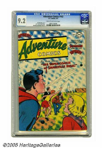<B>Adventure Comics #162 (DC, 1951) CGC NM- 9.2 Cream to off-white pages.</B></I> Punch-outs with supervillains are all well and good, but we loved these early Superboy stories and their scenes of small-town fun. This cover with its new twist on the shotput has been credited to Win Mortimer. In addition to the Superboy feature, there are stories starring Aquaman, Johnny Quick, and Green Arrow. Overstreet 2005 NM- 9.2 value = $550. CGC census 6/05: 1 in 9.2, none higher.