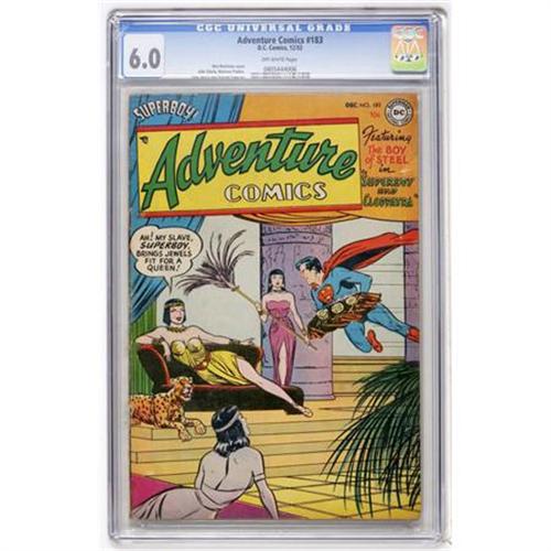 <B>Adventure Comics #183 (DC, 1952) CGC FN 6.0 Off-white pages.</B></I> Superboy meets Cleopatra. Aquaman, Green Arrow, and Johnny Quick appear in separate backup stories. Win Mortimer cover. The highest graded of just two CGC-certified copies of this issue to date. Overstreet 2007 FN 6.0 value = $123. CGC census 1/08: 1 in 6.0, none higher. <I> From the Toronto Collection.</B></I><BR><BR><b>Shipping:</b> Comics - Slabbed (certified) (<a target="_blank" href="http://www.heritageauctions.com/common/shipping.php">view shipping information</a>)
