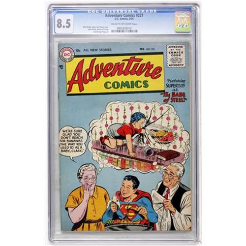 <B>Adventure Comics #221 (DC, 1956) CGC VF+ 8.5 Cream to off-white pages.</B></I> Superboy cover by Curt Swan. Aquaman and Green Arrow backup features. This is the only CGC-graded copy of this issue to date. Overstreet 2007 VF 8.0 value = $180; VF/NM 9.0 value = $278. CGC census 1/08: 1 in 8.5, none higher. <I> From the Toronto Collection.</B></I><BR><BR><b>Shipping:</b> Comics - Slabbed (certified) (<a target="_blank" href="http://www.heritageauctions.com/common/shipping.php">view shipping information</a>)