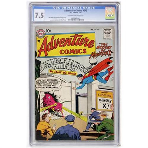 <B>Adventure Comics #245 (DC, 1958) CGC VF- 7.5 Cream to off-white pages.</B></I> Curt Swan cover. Al Plastino and Ramona Fradon art. Overstreet 2007 VF 8.0 value = $180. CGC census 1/08: 1 in 7.5, 2 higher. <I> From the Toronto Collection.</B></I><BR><BR><b>Shipping:</b> Comics - Slabbed (certified) (<a target="_blank" href="http://www.heritageauctions.com/common/shipping.php">view shipping information</a>)