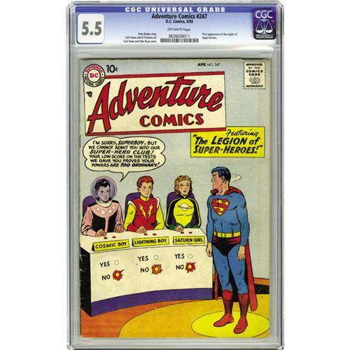 <B>Adventure Comics #247 (DC, 1958) CGC FN- 5.5 Off-white pages.</B></I> The Legion of Super-Heroes, who made their first appearance here, were reportedly only intended as one-issue characters by their creators, editor Mort Weisinger and writer Otto Binder. But fan response was so immense that they were brought back for many more stories and soon took over this series entirely. The story has the first appearances of Cosmic Boy, Saturn Girl, and Lightning Boy (later called Lightning Lad), who travel back in time to put Superboy through some tests with an eye toward offering him membership. The book has a Curt Swan cover and Al Plastino interior art. Green Arrow and Aquaman appear in backup features. Overstreet 2006 FN 6.0 value = $1,110. CGC census 5/06: 4 in 5.5, 21 higher. <BR><BR><B>Important notice:</B> Heritage usually auctions material at the rate of 200-250 lots per hour. On some occasions eBay Live bid software or the Internet may not be able to keep up with the pace of the auction. We recommend placing a realistic absentee bid now as insurance to avoid disappointment. Occasionally the auctioneer may eliminate or reject an eBay Live bid, and the auctioneer may also reopen a lot after the close of the eBay live bidding (usually because we missed an audience bid), and may reject your bid even if it shows you as the winning bidder. By bidding via eBay Live, you agree that Heritage may award the lot to another bidder at its sole discretion under the circumstances described above or any other reasonable circumstances. Since eBay bids are not shown to us until we open the lot on the floor, we treat those bids just like floor bids. In most cases the floor responds before the eBay bid is presented to us, due to Internet lag time, so for consistency we have made it a policy that floor bids are always considered first over tie eBay live bids. Also please note that all Heritage lots purchased through eBay Live carry a 22.5% Buyer's Premium. Please make sure you read the Terms and Conditions before you bid. This lot is being auctioned in conjunction with a live floor auction by Heritage Auction Galleries. All final auction and invoice information will be supplied by Heritage Auction Galleries, and all other information should be considered preliminary. Lot:41001 <BR><BR><B>Winning Notification and Billing:</B> After the FINAL session in this auction is complete, Heritage will send e-mail and snail mail invoices. This process normally takes several days. All final auction and invoice information will be supplied by Heritage Auction Galleries, and all other information should be considered preliminary. <BR><BR>This auction will be conducted on a live auction floor and over the Internet through eBay Live. If you choose to place an absentee bid, please take a moment to <font color='#0000ff'><u><a href='http://pages.ebay.com/liveauctions/help/before/laabsentee.html'>learn how eBay Live absentee bidding works</a></u></font><font color='#000000'>