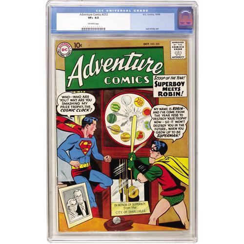 <B>Adventure Comics #253 (DC, 1958) CGC VF+ 8.5 Off-white pages.</B></I> First meeting of Superboy and Robin. Curt Swan cover. Green Arrow backup by Jack Kirby. Al Plastino, Henry Boltinoff, Bob Oksner, and Ramona Fradon art. Overstreet 2006 VF 8.0 value = $184; VF/NM 9.0 value = $272. CGC census 3/07: 2 in 8.5, none higher.<BR><BR><b>Shipping:</b> Comics - Slabbed (certified) (<a target="_blank" href="http://www.heritageauctions.com/common/shipping.php">view shipping information</a>)