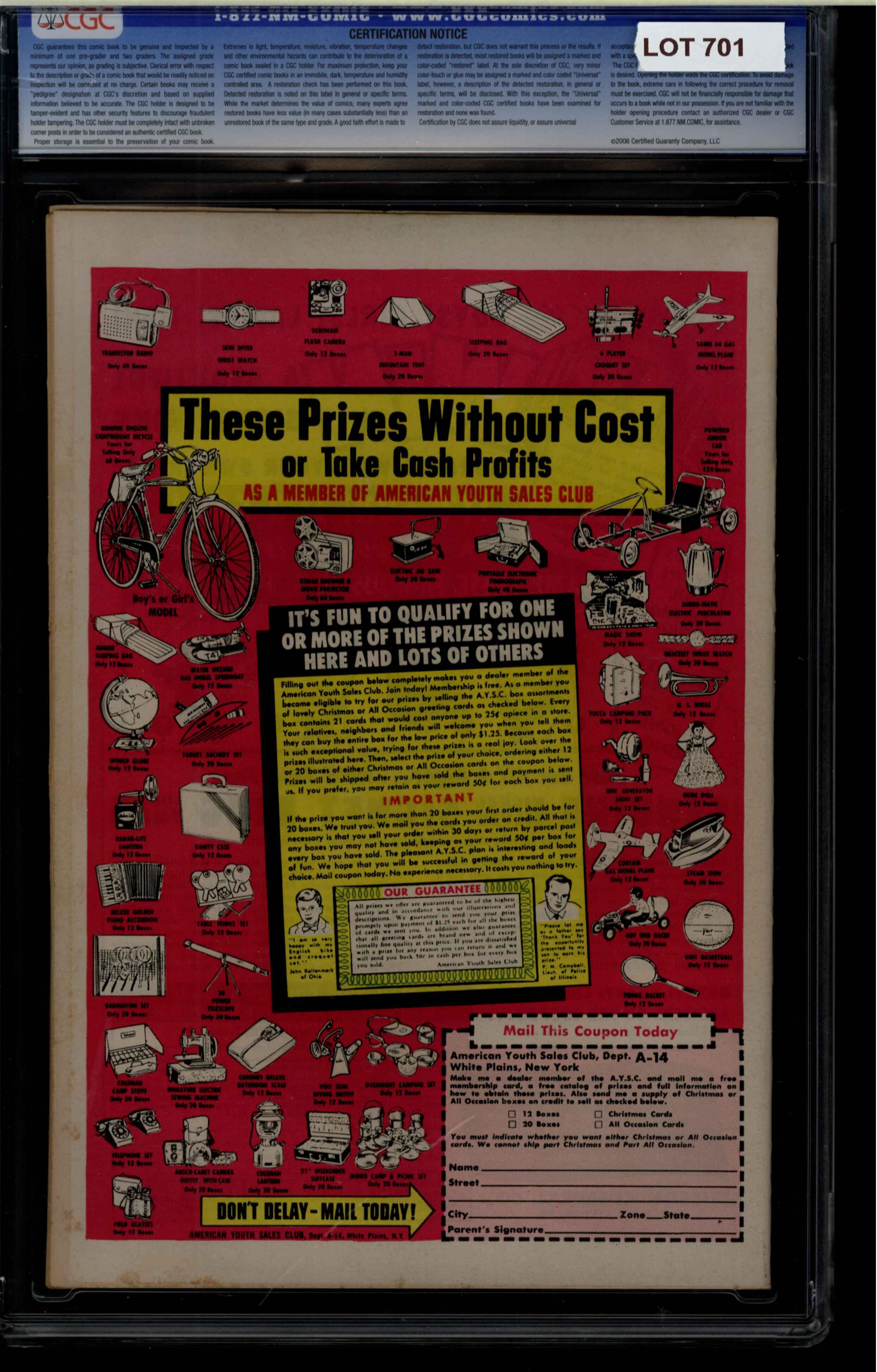 The Auctioneer has reserved the right to reject any and all bids, and to bid at the auction. Auctioneers Auctions are not on approval. Auctioneer does not allow certified material to be returned because of possible differences of opinion with respect to the grade offered by any third party organization, dealer, or service. Absolutely no guarantee of grade is offered for un-certified property sold and subsequently submitted to a third-party grading service. There will be no exceptions to this policy. Under extremely limited circumstances, (e.g. gross cataloging error) a purchaser, who did not bid from the floor, may request Auctioneer to evaluate voiding a sale; such request must be made in writing detailing the alleged gross error, and submission of the lot to the Auctioneer must be pre-approved by the Auctioneer. Bidder must notify Auctioneer in writing of such request within three (3) days of the non-floor bidder receipt of the lot. Any lot that is to be evaluated must be in our offices within 30 days after Auction. Grading does not qualify for this evaluation process nor do such complaints constitute a basis to challenge the authenticity of a lot. AFTER THAT 30-DAY PERIOD, NO LOTS MAY BE RETURNED FOR REASONS OTHER THAN AUTHENTICITY. Lots returned must be housed intact in the original holder. No lots purchased by floor Bidders may be returned (including those Bidders acting as agents for others). Late remittance for purchases may be considered just cause to revoke all return privileges. B: Auctions conducted solely on the Internet have a THREE (3) DAY RETURN POLICY: Lots paid for within seven days of the Auction closing are sold with a three (3) day return privilege. You may return lots under the following conditions: Within three days of receipt of the lot, you must first notify Auctioneer by contacting Client Service by phone (314-680-8599) or e-mail (moundcityauctions@gmail.com), and immediately mail the lot(s) fully insured to the attention of Returns, Mound City Auctions 1081 Teson Rd. Hazelwood, MO. 63042. Lots must be housed intact in their original holder and in their original condition. You are responsible for the insured, safe delivery of any lots. Auctioneer will not be responsible for lots returned in non-registered mail or lots returned without prior authorization per section B. A non-negotiable return fee of 5% of the purchase price ($10 per lot minimum) will be deducted from the refund for each returned lot or billed directly. Postage and handling fees are not refunded. After the three-day period (from receipt), no items may be returned for any reason. Late remittance for purchases revokes all Return-Restock privileges. C: Bidders who have inspected the lots prior to the auction will not be granted any return privileges. D: Comic books sold referencing a third-party grading service are sold “as is” without any express or implied warranty. Certain warranties may be available from the grading services and the Bidder is referred to them for further details: Certified Guaranty Company, LLC. (CGC), P.O. Box 4738, Sarasota, FL 34230. E: Bidders who intend to challenge authenticity or provenance of a lot must notify Auctioneer in writing within thirty (30) days of the Auctions conclusion. In the event Auctioneer cannot deliver the lot or subsequently it is established that the lot lacks title, provenance, authenticity, or other transfer or condition issue is claimed, Auctioneer's liability shall be limited to rescission of sale and refund of purchase price; in no case shall Auctioneer's maximum liability exceed the high bid on that lot, which bid shall be deemed for all purposes the value of the lot. After one year has elapsed, Auctioneer's maximum liability shall be limited to any commissions and fees Auctioneer earned on that lot. F: All comics are guaranteed genuine, but are not guaranteed as to grade, since grading is a matter of opinion, an art and not a science, and therefore the opinion rendered by the Auctioneer or any third party grading service may not agree with the opinion of others (including trained experts), and the same expert may not grade the same item with the same grade at two different times. G: Since we cannot examine encapsulated comics, they are sold “as is”without our grading opinion, and may not be returned for any reason. Auctioneer shall not be liable for any patent or latent defect or controversy pertaining to or arising from any encapsulated collectible. In any such instance, purchaser's remedy, if any, shall be solely against the service certifying the collectible. H: Due to changing grading standards over time, differing interpretations, and to possible mishandling of items by subsequent owners, Auctioneer reserves the right to grade items differently than shown on certificates from any grading service that accompany the items. Auctioneer also reserves the right to grade items differently than the grades shown in the prior catalog should such items be reconsigned to any future auction. I: Although consensus grading is employed by most grading services, it should be noted as aforesaid that grading is not an exact science. In fact, it is entirely possible that if a lot is broken out of a plastic holder and resubmitted to another grading service or even to the same service, the lot could come back with a different grade assigned. J: Certification does not guarantee protection against the normal risks associated with potentially volatile markets. The degree of liquidity for certified collectibles will vary according to general market conditions and the particular lot involved. For some lots there may be no active market at all at certain points in time."