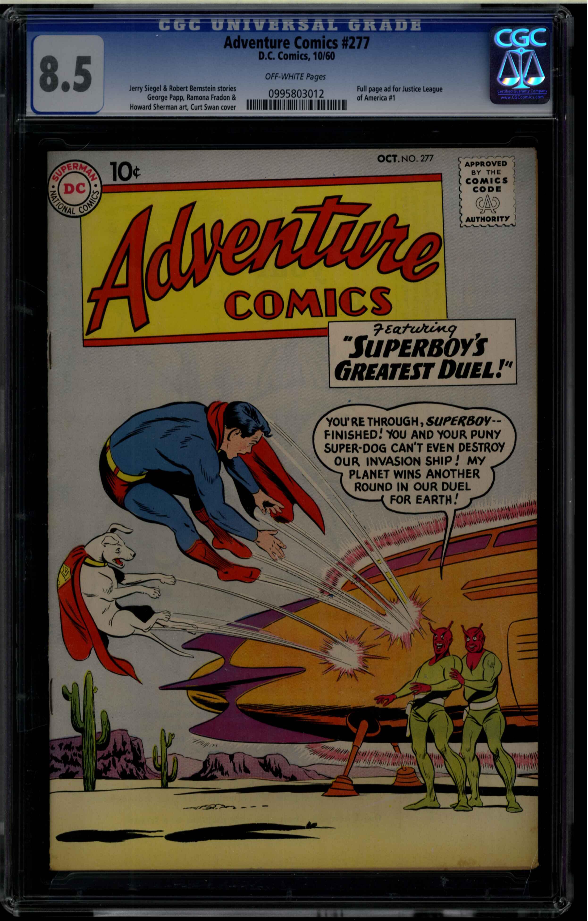 Universal 8.5 OFF-WHITE Jerry Siegel & Robert Bernstein stories George Papp Ramona Fradon & Howard Sherman art Curt Swan cover of America #1 Full page ad for Justice League. CGC census: Only 2 at 8.5 with none higher!