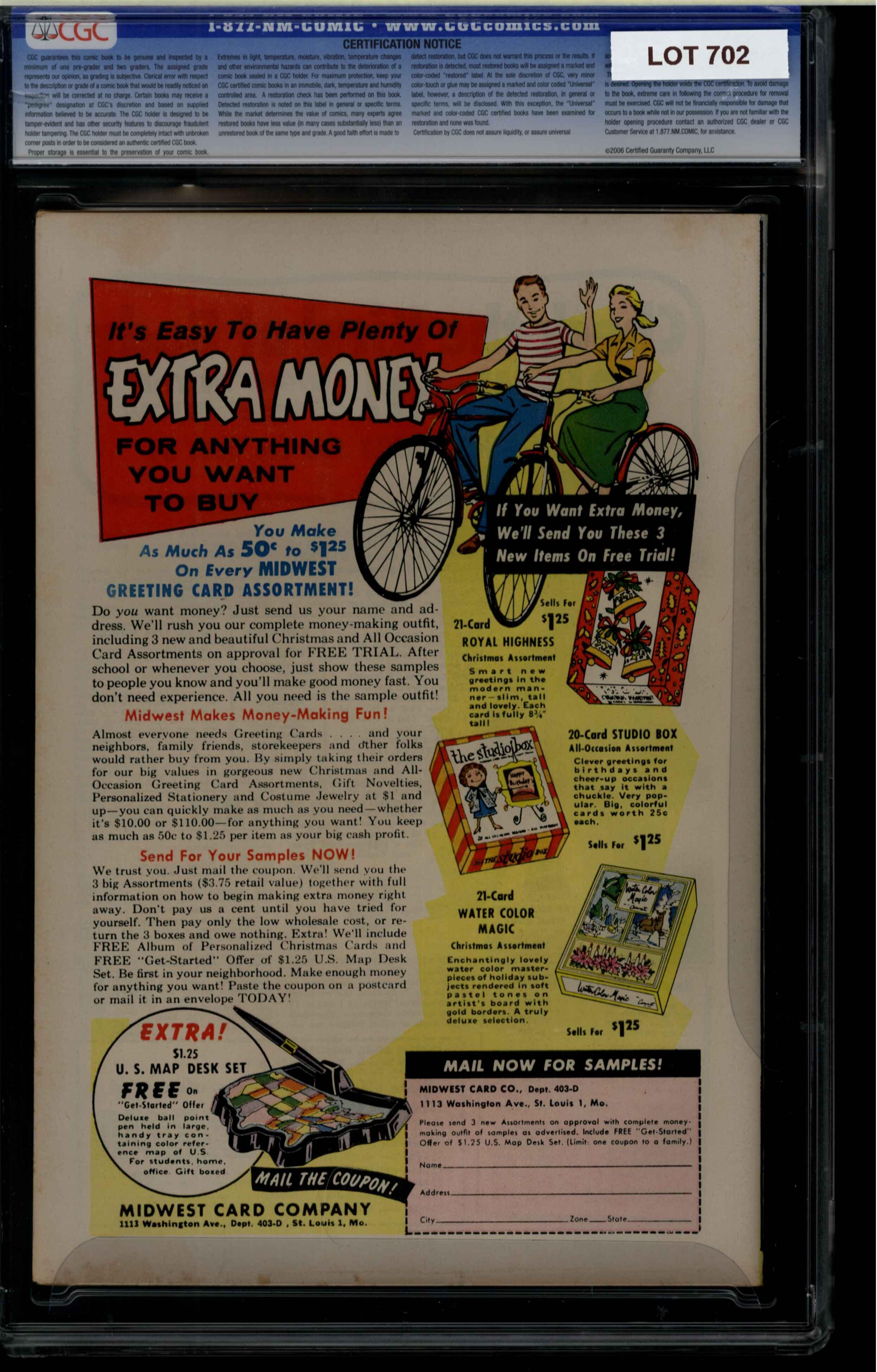 The Auctioneer has reserved the right to reject any and all bids, and to bid at the auction. Auctioneers Auctions are not on approval. Auctioneer does not allow certified material to be returned because of possible differences of opinion with respect to the grade offered by any third party organization, dealer, or service. Absolutely no guarantee of grade is offered for un-certified property sold and subsequently submitted to a third-party grading service. There will be no exceptions to this policy. Under extremely limited circumstances, (e.g. gross cataloging error) a purchaser, who did not bid from the floor, may request Auctioneer to evaluate voiding a sale; such request must be made in writing detailing the alleged gross error, and submission of the lot to the Auctioneer must be pre-approved by the Auctioneer. Bidder must notify Auctioneer in writing of such request within three (3) days of the non-floor bidder receipt of the lot. Any lot that is to be evaluated must be in our offices within 30 days after Auction. Grading does not qualify for this evaluation process nor do such complaints constitute a basis to challenge the authenticity of a lot. AFTER THAT 30-DAY PERIOD, NO LOTS MAY BE RETURNED FOR REASONS OTHER THAN AUTHENTICITY. Lots returned must be housed intact in the original holder. No lots purchased by floor Bidders may be returned (including those Bidders acting as agents for others). Late remittance for purchases may be considered just cause to revoke all return privileges. B: Auctions conducted solely on the Internet have a THREE (3) DAY RETURN POLICY: Lots paid for within seven days of the Auction closing are sold with a three (3) day return privilege. You may return lots under the following conditions: Within three days of receipt of the lot, you must first notify Auctioneer by contacting Client Service by phone (314-680-8599) or e-mail (moundcityauctions@gmail.com), and immediately mail the lot(s) fully insured to the attention of Returns, Mound City Auctions 1081 Teson Rd. Hazelwood, MO. 63042. Lots must be housed intact in their original holder and in their original condition. You are responsible for the insured, safe delivery of any lots. Auctioneer will not be responsible for lots returned in non-registered mail or lots returned without prior authorization per section B. A non-negotiable return fee of 5% of the purchase price ($10 per lot minimum) will be deducted from the refund for each returned lot or billed directly. Postage and handling fees are not refunded. After the three-day period (from receipt), no items may be returned for any reason. Late remittance for purchases revokes all Return-Restock privileges. C: Bidders who have inspected the lots prior to the auction will not be granted any return privileges. D: Comic books sold referencing a third-party grading service are sold “as is” without any express or implied warranty. Certain warranties may be available from the grading services and the Bidder is referred to them for further details: Certified Guaranty Company, LLC. (CGC), P.O. Box 4738, Sarasota, FL 34230. E: Bidders who intend to challenge authenticity or provenance of a lot must notify Auctioneer in writing within thirty (30) days of the Auctions conclusion. In the event Auctioneer cannot deliver the lot or subsequently it is established that the lot lacks title, provenance, authenticity, or other transfer or condition issue is claimed, Auctioneer's liability shall be limited to rescission of sale and refund of purchase price; in no case shall Auctioneer's maximum liability exceed the high bid on that lot, which bid shall be deemed for all purposes the value of the lot. After one year has elapsed, Auctioneer's maximum liability shall be limited to any commissions and fees Auctioneer earned on that lot. F: All comics are guaranteed genuine, but are not guaranteed as to grade, since grading is a matter of opinion, an art and not a science, and therefore the opinion rendered by the Auctioneer or any third party grading service may not agree with the opinion of others (including trained experts), and the same expert may not grade the same item with the same grade at two different times. G: Since we cannot examine encapsulated comics, they are sold “as is”without our grading opinion, and may not be returned for any reason. Auctioneer shall not be liable for any patent or latent defect or controversy pertaining to or arising from any encapsulated collectible. In any such instance, purchaser's remedy, if any, shall be solely against the service certifying the collectible. H: Due to changing grading standards over time, differing interpretations, and to possible mishandling of items by subsequent owners, Auctioneer reserves the right to grade items differently than shown on certificates from any grading service that accompany the items. Auctioneer also reserves the right to grade items differently than the grades shown in the prior catalog should such items be reconsigned to any future auction. I: Although consensus grading is employed by most grading services, it should be noted as aforesaid that grading is not an exact science. In fact, it is entirely possible that if a lot is broken out of a plastic holder and resubmitted to another grading service or even to the same service, the lot could come back with a different grade assigned. J: Certification does not guarantee protection against the normal risks associated with potentially volatile markets. The degree of liquidity for certified collectibles will vary according to general market conditions and the particular lot involved. For some lots there may be no active market at all at certain points in time."
