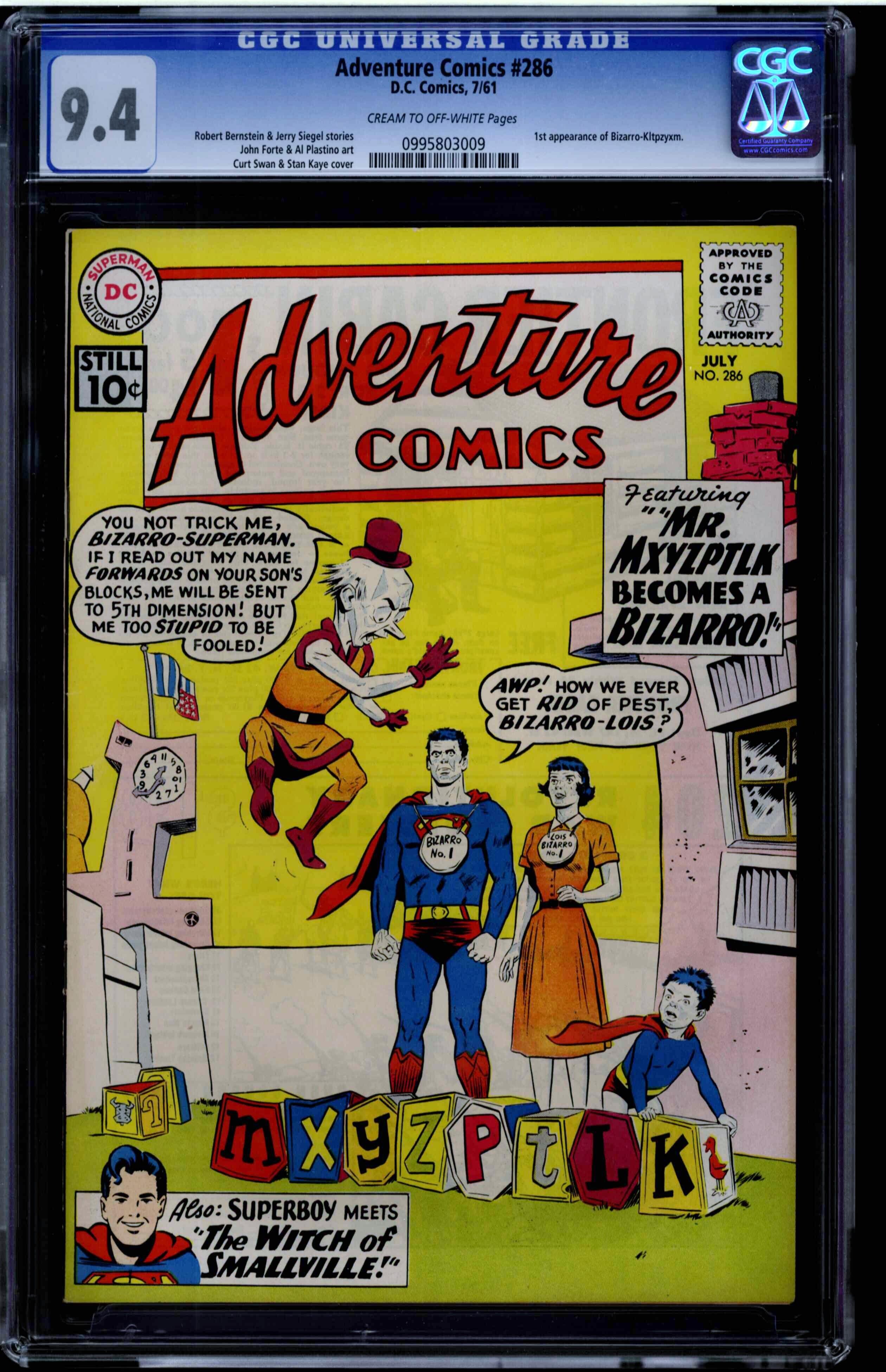 Universal 9.4 CREAM TO OFF-WHITE Robert Bernstein & Jerry Siegel stories John Forte & Al Plastino art Curt Swan & Stan Kaye cover 1st appearance of Bizarro-Kltpzyxm. CGC census: 1 at 9.4, none higher! BEST KNOWN!