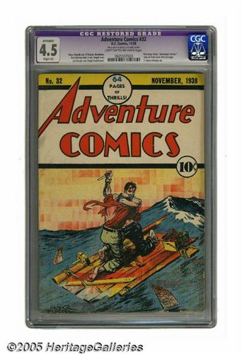 <B>Adventure Comics #32 (DC, 1938) CGC Apparent VG+ 4.5 Slight (A) Light tan to off-white pages.</B></I> One of DC's first series, <B>New Adventure Comics</B></I> dropped the "New" starting with this issue, giving the series the title it would retain for the next 40 years plus. Creig Flessel's cover scene, a struggle in shark-infested waters, certainly lives up to the comic's new title. Inside the comic, the creators of both Batman and Superman contribute -- Bob Kane drew the adventure of Rusty and his Pals (an adventurer with kid helpers), while writer Jerry Siegel and artist Joe Shuster collaborated on the long-running "Federal Men" feature. The issue is a Gerber "7." CGC notes, "Restoration includes: spine split sealed." Overstreet 2005 GD 2.0 value = $422; VG 4.0 value = $844.