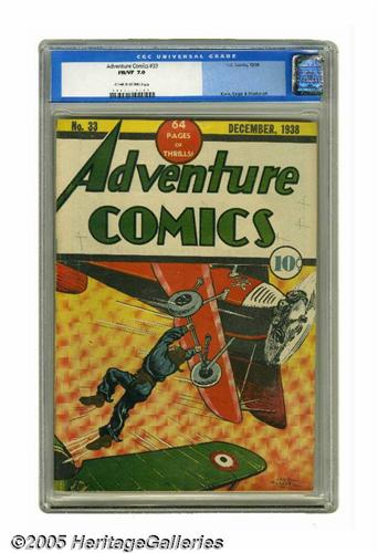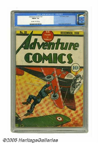 <B>Adventure Comics #33 (DC, 1938) CGC FN/VF 7.0 Off-white to white pages.</B></I> This was only the second issue of this title's decades-long run (following the name change from <B>New Adventure</B></I>). The Creig Flessel cover got things off to a suitably adventurous start; the many features inside the book include an outing for Jerry Siegel and Joe Shuster's Federal Men as well as a humor filler by Bob Kane. Gerber "only" gave this issue a "6," but the fact that CGC has only certified two unrestored copies of the book to date leaves us to believe that there aren't many others out there. Overstreet 2005 FN 6.0 value = $600; VF 8.0 value = $1,100. CGC census 1/05: 1 in 7.0, 1 higher. <I>From the Northern Lights Collection.</B></I>
