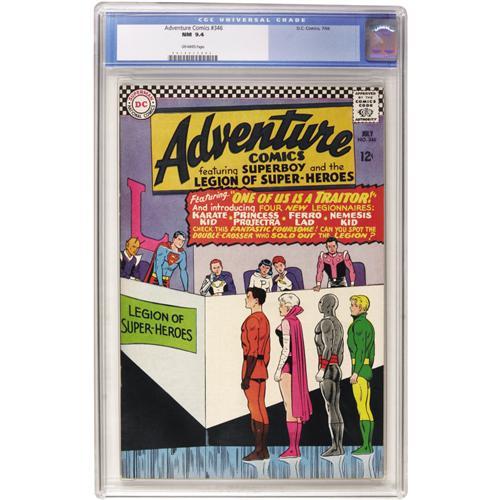 <B>Adventure Comics #346 (DC, 1966) CGC NM 9.4 Off-white pages.</B></I> It's the first appearance of Karate Kid, Princess Projectra, Ferro Lad, and Nemesis Kid... which one could be the traitor? Hint: one character is named <I>Nemesis</B></I> Kid. Speaking of kids, teen whiz Jim Shooter wrote this issue's story. The cover is by Curt Swan. Overstreet 2006 NM- 9.2 value = $100. CGC census 3/07: 3 in 9.4, none higher.<BR><BR><b>Shipping:</b> Comics - Slabbed (certified) (<a target="_blank" href="http://www.heritageauctions.com/common/shipping.php">view shipping information</a>)