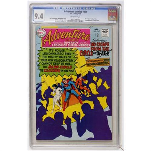 <B>Adventure Comics #367 Off-white pages (DC, 1968) CGC NM 9.4 Off-white pages.</B></I> New Legion Headquarters. First appearance of the Dark Circle. Neal Adams cover. Curt Swan, Sheldon Moldoff, and George Klein art. Overstreet 2007 NM- 9.2 value = $65. CGC census 6/07: 2 in 9.4, 1 higher.<BR><BR><b>Shipping:</b> Comics - Slabbed (certified) (<a target="_blank" href="http://www.heritageauctions.com/common/shipping.php">view shipping information</a>)