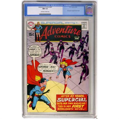 <B>Adventure Comics #381 (DC, 1969) CGC NM 9.4 Off-white to white pages.</B></I> The first-ever book-length Supergirl story. Batgirl and Superman appear. Curt Swan and Neal Adams cover. Overstreet 2007 NM- 9.2 value = $160. CGC census 6/07: 11 in 9.4, 4 higher.<BR><BR><b>Shipping:</b> Comics - Slabbed (certified) (<a target="_blank" href="http://www.heritageauctions.com/common/shipping.php">view shipping information</a>)