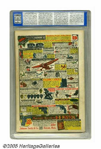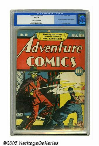<B>Adventure Comics #40 (DC, 1939) CGC VG 4.0 Cream to off-white pages.</B></I> This amazing cover by Creig Flessel introduced the world to the ominous look of the Sandman, who made his <B>Adventure Comics</B></I> debut here (this is believed to be the first Sandman story to be created, with his <B>New York World's Fair Comics</B></I> appearance beating it to publication). This issue is called "rare" by Overstreet, and unrestored copies seem to be particularly hard to find. The best CGC-graded copy is only a 7.0, and only a handful have been graded higher than our offering. This issue is number 11 in the 2004 Overstreet list of the most valuable Golden Age books; you can't go wrong with this key issue. Overstreet 2005 VG 4.0 value = $8,750. CGC census 2/05: 1 in 4.0, 5 higher.