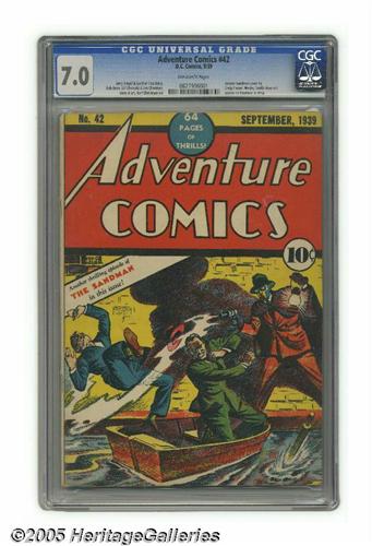 <B>Adventure Comics #42 (DC, 1939) CGC FN/VF 7.0 Off-white pages.</B></I> This issue's Sandman cover was only the second by Creig Flessel to feature the character, and Flessel's use of greytone is impressive indeed. The comic's interior features include art by Wayne Boring and Bob Kane. The book is a Gerber "7". Overstreet 2005 FN 6.0 value = $2,031; VF 8.0 value = $4,739. CGC census 1/05: 1 in 7.0, 1 higher. <I>From the Northern Lights Collection.</B></I>
