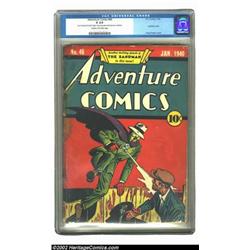 Adventure Comics #46 (DC, 1940) CGC GD 2.0 Cream to off-white pages. This image of Sandman by Creig Flessel could easily be considered "the" classic depiction of this fantastic Golden Age hero. The condition of this issue was brought down by the tape along spine and centerfold, and the cover is detached from the bottom staple. The page quality is still decent and the cover has remained bright. Overstreet 2002 GD 2.0 value = $438. Important notice: We expect to be auctioning lots at the rate of 200-250 per hour. Sometimes eBay Premier live bid software cannot keep up with that pace, so we strongly recommend that you place a realistic proxy bid now as insurance to avoid disappointment. Also please note that all Heritage/CAA lots purchased through eBay Premier carry a 20% Buyer's Premium. Please make sure you read the Terms and Conditions.