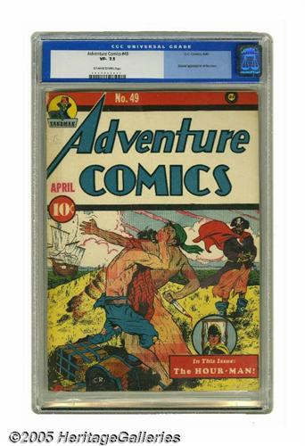 <B>Adventure Comics #49 (DC, 1940) CGC VF- 7.5 Off-white to white pages.</B></I> Hourman's second appearance came in this issue, which also featured the last generic cover, a pirate-themed (always a crowd pleaser...) beauty by Creig Flessel...or is it Leo O'Mealia? Interior artists include Bernard Baily and Bob Kane. This is the second highest-graded copy to be certified by CGC to date. Overstreet 2005 VF 8.0 value = $1,638. CGC census 3/05: 1 in 7.5, 1 higher. <I>From the Northern Lights Collection.</B></I>
